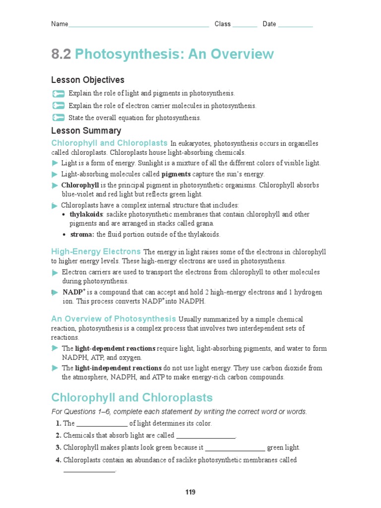 PDF 8.2 Photosynthesis: An Overview - Mrs. Eggleston 4.Chloroplasts contain an abundance of saclike photosynthetic membranes called . 5. The is the fluid portion of the chloroplast located outside the thylakoids. 6. The visible light absorbed by chlorophyll the energy level of the chlorophyll's electrons. 7. Label the internal parts of the chloroplast below. PDF Bio 10: Ch 8.2 Photosynthesis: An Overview Chloroplasts contain an abundance of saclike photosynthetic membranes called . 119 Name Class Date 5. The is the fluid portion of the chloroplast located outside the thylakoids. 6. The visible light absorbed by chlorophyll the energy level of the chlorophyll's electrons. 7. Label the internal parts of the chloroplast below. Chlorophyll & Chloroplasts Flashcards - Quizlet Photosysyem A saclike photosynthetic membrane found in chloroplasts Thylakoid Energy carrier made as a result of of photosystem II ATP Process of using suns energy to make food Photosynthesis man who worked out the light-independent reactions calvin Liquid part of the inside of a chloroplast Stroma Chemical that absorbs light for photosynthesis