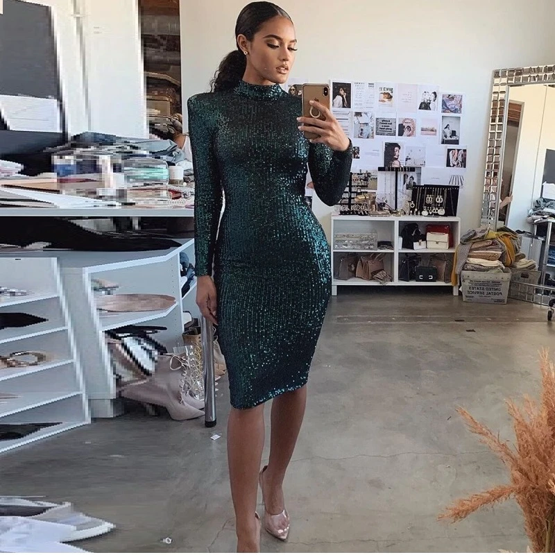 New Fashion Hot Selling Sexy Mature Long Sleeve Sequin Party Outfit Women Dress Clubbing Bodycon Vestido Wholesale Online