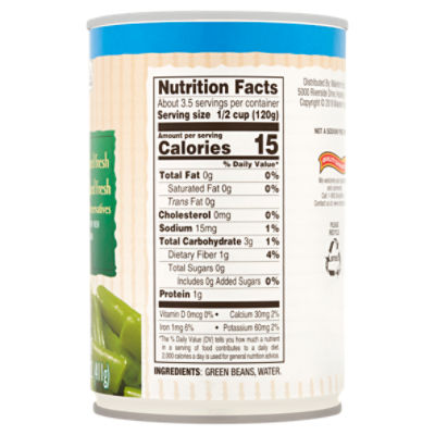 Blue Lake® Cut Green Beans | Del Monte® Green Beans, Water, Sea Salt. Undrained Nutrition Item Left Value Right Value Serving Size 1/2 cup (121g) Amount Per Serving 1/2 cup Calories 20 Calories From Fat 0 Total Fat 0g 0% Saturated Fat 0g 0% Trans Fat 0g Cholesterol 0mg 0% Sodium 380mg 16% Potassium 100mg 3% Total Carbohydrates 3g 1% Dietary Fiber 1g 4% Sugars 1g Protein 1g Vitamin A 6% Green Beans | SNAP-Ed Also available in Spanish translation of Using, Storing, and Preserving Snap Beans, Arabic translation of Using, Storing, and Preserving Snap Beans. Green Beans Poster (PDF, 1.3MB). SNAP-Ed. Iowa Nutrition Network. Pick a Better Snack. Preserving Green Beans (PDF, 364KB). Kansas State University. All About Beans - Brochure (PDF, 2.9 MB). SNAP-Ed.