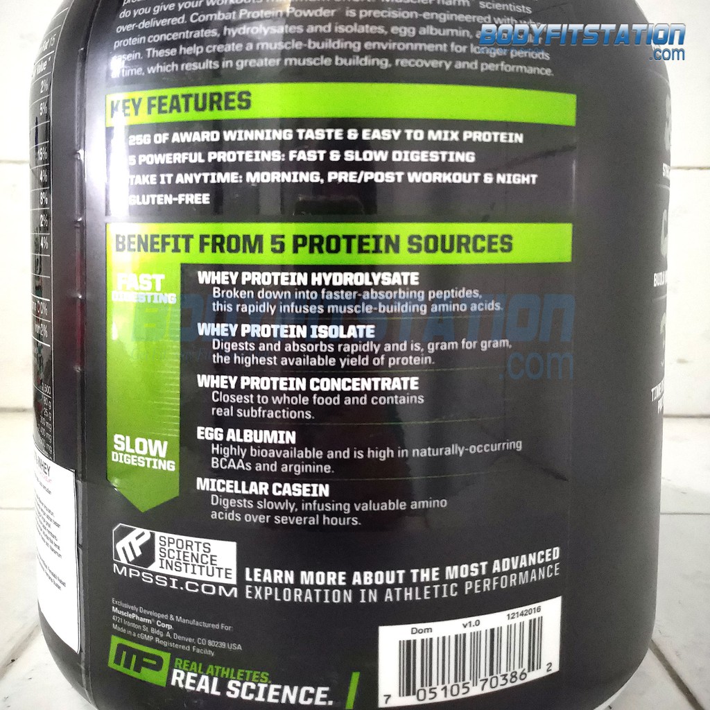 Musclepharm Combat Protein Powder Gluten Free 25 GR Protein with No ... The great-tasting, easy-mixing digestive blend is fine-tuned for true nutrient utilization-a step ahead in protein powder technology. Most other protein products seem to be okay with the status quo, the minimum. But ask yourself: do you give your workouts minimum effort? MusclePharm scientists over-delivered. Combat Protein Powder is precision-engineered with whey protein concentrates, hydrolysates and isolates, egg albumin, and micellar casein.