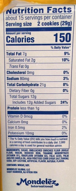 Nabisco Oreo Double Stuf Chocolate Sandwich Cookies Family Size Ingredients Sugar, Unbleached Enriched Flour (Wheat Flour, Niacin, Reduced Iron, Thiamine Mononitrate (Vitamin B1), Riboflavin (Vitamin B2), Folic Acid), Palm and/or Canola Oil Cocoa (Processed with Alkali), High Fructose Corn Syrup, Leavening (Baking Soda and/or Calcium Phosphate), Salt, Soy Lecithin, Chocolate, Artificial Flavor. Safety warning