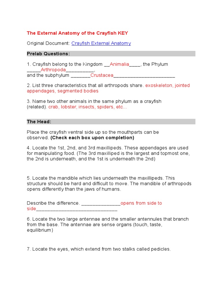9 - The External Anatomy of the Crayfish - Course Hero View Notes - 9 - The External Anatomy of the Crayfish from SCIENCE Anatomy an at Superior High School. The External Anatomy of the Crayfish Prelab Questions: L Crayfish belong to the Kingdom , the. Study Resources. Main Menu; by School; by Literature Title; by Subject; by Study Guides; Textbook Solutions Expert Tutors Earn. Crayfish external Anatomy Diagram | Quizlet The back part of the crayfish made of 6 segments and a telson. Cephalothorax The front part of the crayfish composed of the head and thorax fused together. rostrum A sharp pointed projection of the carapace from the front of the head. Swimmerets small appendages on the underside of the abdomen. Uropods Crayfish Anatomy Part 1 - YouTube External anatomy of a crayfish. Phylum Arthropoda, Subphylum Crustacea. Both male and female specimens are examined.Part 2 of the crayfish anatomy can be fou... Crayfish dissection-- External Anatomy - YouTube This high school dissection demonstration identifies the key external features of the common crayfish. Resources related to this labcast available at ...