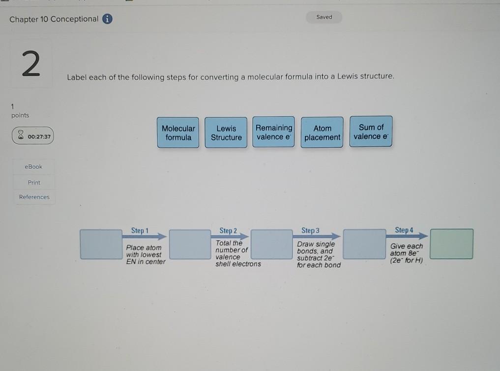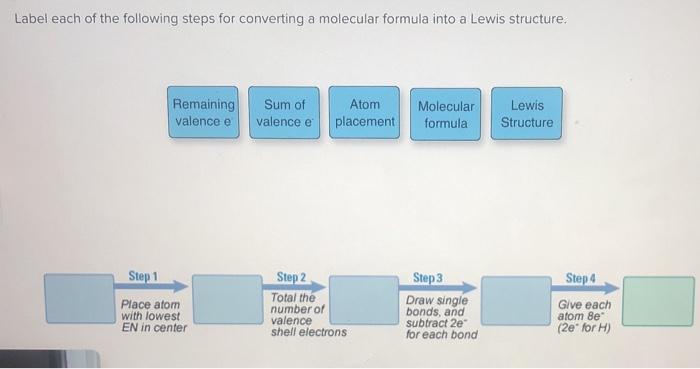 Solved Label each of the following steps for converting a | Chegg.com Step 1 Step 2 Molecular formula Step 3 Step 4 Atom placement Sum of valence e Question: Label each of the following steps for converting a molecular formula into a Lewis structure. Draw single bonds. Subtract 2e for each bond. Place atom with lowest electronegativity in the center. Determine the total number of valence shell electrons.