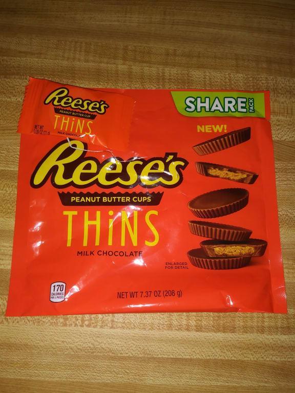 REESE'S THiNS Milk Chocolate Peanut Butter Cups Candy, 7.37 oz, Share ... Calories per gram: Fat 9 • Carbohydrate 4 • Protein 4 . Product details. Indulge in the sweet, creamy combo of milk chocolate and peanut butter, now in a thin cup. Reese's Thins milk chocolate peanut butter cups have the same great flavor you already love, but now in a thin cup perfectly sized for snacking or sharing. Keep your office ...