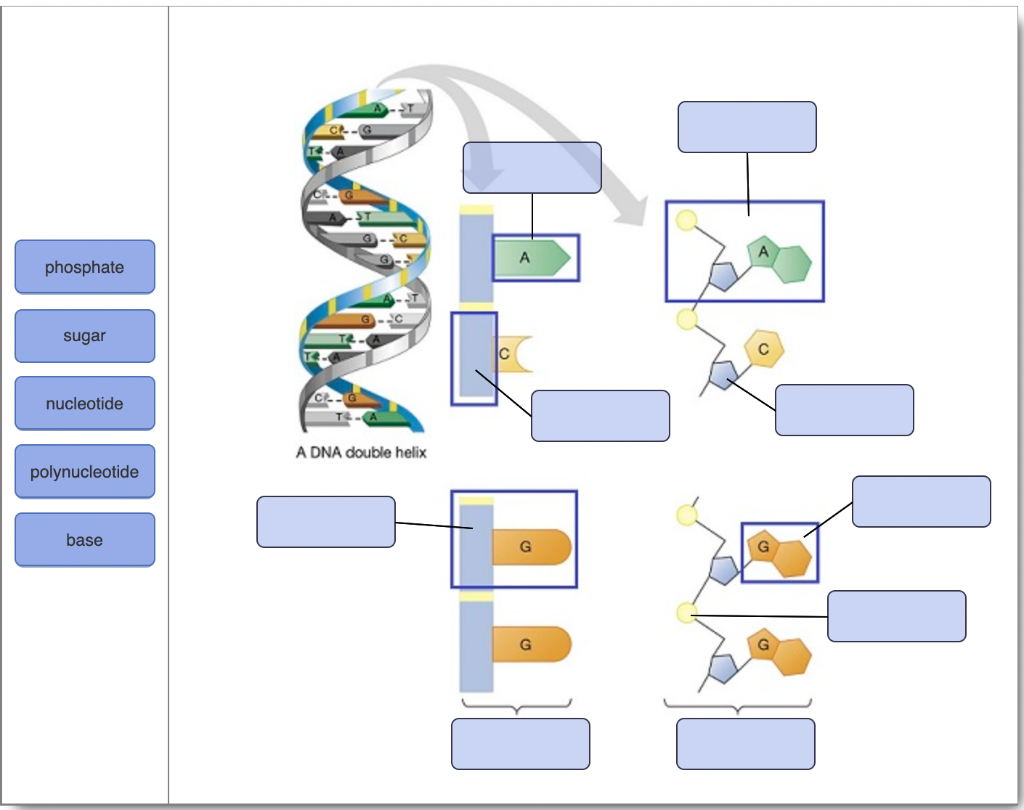 Bio 111 - Chapter 15 Assignment Flashcards | Quizlet Can you correctly label various parts of a DNA molecule? a. double helix b. phosphate group c. deoxyribose d. hydrogen bond e. base pair f. nucleotide g. nitrogenous base In the accompanying image, a nucleotide is indicated by the letter _____. B Which of these is a difference between a DNA and an RNA molecule?