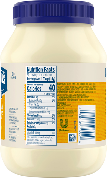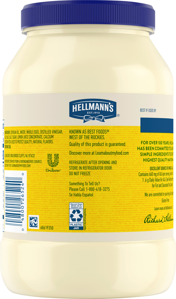 Real Mayonnaise | Hellmann's | Hellmann's US Jun 28, 2015 · Close America's #1 Mayonnaise is made with real, simple ingredients: eggs, oil and vinegar. Hellmann’s® real, 40% of the 1.6g Daily Value for ALA, 10g fat, and 1.5g saturated fat.) Use it to make outrageously juicy meals like our Parmesan Crusted Chicken! View nutrition facts and ingredients Have questions? Inspiration ( 2 items ) Mayonnaise by HELLMANN'S nutrition facts and analysis. Mayonnaise by HELLMANN'S nutrition facts and analysis per 1 tbsp (15.0 ml) aprx (15.0 g) . Mayonnaise by HELLMANN'S belong to 'Salad Dressing & Mayonnaise' food category. The UPC for this product is 068400657040.