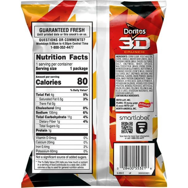 Doritos Calories in 100g or Ounce. 4 Facts To Consider 10.5 cubes of sugar. Take a look at tables below to see details about Doritos nutrition. Calories in Doritos Based On Branded Category. See all nutrition data of Doritos on charts. Calories 519 kcal/100g (147 kcal/oz) Protein 7.4 g/100g (2.1 g/oz) Carbs Total 60.8 g/100g (17.2 g/oz) Fat 27.4 g/100g (7.8 g/oz) Doritos, Nacho Cheese Flavored, Tortilla Chips - SmartLabel™ May 24, 2022 ... Smartlabel Logo. Doritos ... Please Refer To Your Product Label For The Most Accurate Nutrition, Ingredient, Allergen And Other Product ... Doritos® Reduced Fat Nacho Cheese Flavored Tortilla Chips - 1oz. WEIGHT OF GRAIN: 24.26 g SMART SNACK COMPLIANT: Yes - first ingredient whole MEETS USDA WHOLE GRAIN-RICH CRITERIA: Yes Nutritional Facts Servings Per Container: 1 Serving Size: 1 package Calories: 130 *25% Less Fat Than Regular Doritos® Tortilla Chips, **Total Fat content of regular Doritos® Nacho Cheese Tortilla Chips is 8g per 1oz. serving. DORITOS® Mix Variety Pack | Variety Packs DORITOS®Nacho Cheese Flavored Tortilla Chips The % Daily Value (DV) tells you how much a nutrient in a serving of food contributes to a daily diet. 2,000 calories a day is used for general nutrition advice. All products are labeled accurately with the most current ingredient information.
