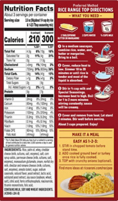 Rice-A-Roni Products, Calories and Nutritional Information - FatSecret Rice-A-Roni Rice: Beef Flavor Per 1 cup prepared - Calories: 230kcal | Fat: 1.00g | Carbs: 51.00g | Protein: 7.00g Broccoli Au Gratin Rice Mix Per 1 cup prepared - Calories: 260kcal | Fat: 6.00g | Carbs: 46.00g | Protein: 8.00g Cheddar & Broccoli Per 1 cup - Calories: 230kcal | Fat: 4.50g | Carbs: 43.00g | Protein: 6.00g Chicken & Garlic Rice-A-Roni Nutrition Facts. Calories, carbs, fat, sodium & more ... Rice-A-Roni Nutrition Facts. Calories, carbs, fat, sodium & more • MyFoodDiary® Food Brands > Rice-A-Roni Search foods 44 items Rice-A-Roni Calories in Rice-A-Roni Mexican Style Flavor Rice-Pasta Mix, prepared ... There are 250 calories in 1 cup of Rice-A-Roni Mexican Style Flavor Rice-Pasta Mix, prepared as directed. You'd need to walk 70 minutes to burn 250 calories. Visit CalorieKing to see calorie count and nutrient data for all portion sizes.