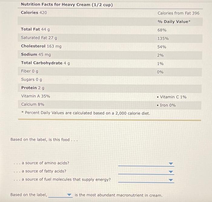 › dairy-nutrition › productsCream: What Is It & Nutrition Facts | U.S. Dairy For example, the half-and-half you might have added to your coffee has between 10.5% to 18% milkfat, while heavy cream (or “heavy whipping cream,” as it’s often called) contains more than 36% milkfat. Both the amount of fat in cream and its temperature influence how well cream whips. › nutrition › heavy-whipping-creamHeavy Whipping Cream: Nutrition, Uses, Benefits, and More - ... May 27, 2019 · Uses of heavy whipping cream. Calories: 408. Protein: 3 grams. Fat: 43 grams. Carbs: 3 grams. Vitamin A: 55% of the Daily Value (DV) Vitamin D: 10% of the DV. Vitamin E: 7% of the DV. Calcium: 6% of the DV. Phosphorus: 6% of the DV. Choline: 4% of the DV. Heavy Cream Nutrition Facts and Health Benefits - Verywell Fit Heavy Cream Nutrition Facts · Calories: 809 · Fat: 85.9g · Sodium: 64.3mg · Carbohydrates: 6.76g · Fiber: 0g · Sugars: 6.95g · Protein: 6.8g · Calcium: ... › food › heavy-creamCalories in Heavy Cream - Nutritionix Heavy Cream Nutrition Facts Serving Size: fl oz ( 30g ) Heavy Cream Amount Per Serving Calories 101 % Daily Value* Total Fat 11g 14% Saturated Fat 6.9g 35% Trans Fat 0.4g Polyunsaturated Fat 0.5g Monounsaturated Fat 2.7g Cholesterol 34mg 11% Sodium 8mg 0% Total Carbohydrates 0.8g 0% Dietary Fiber 0g 0% Sugars 0.9g Protein 0.9g